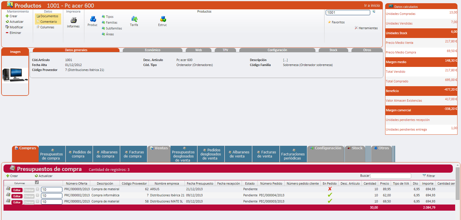 Administrará los presupuestos realizados a sus clientes, generará automáticamente sus pedidos una vez aceptados. Control de expediciones de productos y facturación.